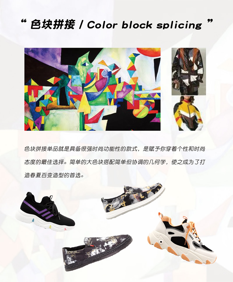 色块拼接的时尚之路继续前行,更多创意的拼接展现不同风格的时尚元素,色块和线条往往能够成为鞋子亮眼的时尚点。